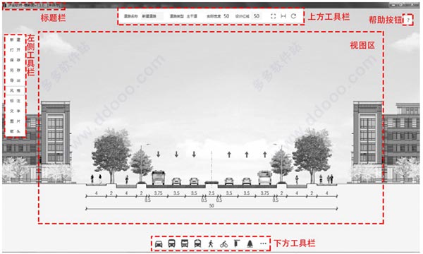 完整的断面图由断面、侧边景观带、标注面板、方向面板、天空和地基背景组成,断面由各种断面元素组成。