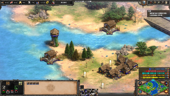 3、 建城墙把三座桥封死, 然后升城堡时代到9点中的浅滩造两座城堡, 发育一段时间后就可以反攻了。 两个敌人都没什么守军, 城堡时代就可将迦菲奇杀死, 然后攻克摩尔人的阵地, 把车领出来, 送回家过关。