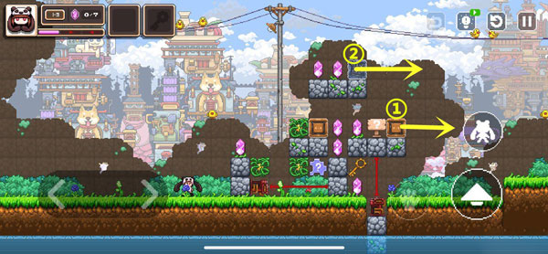 推动箱子挡住机关,借助泡泡跳到右侧,并在图示位置留下幻象。