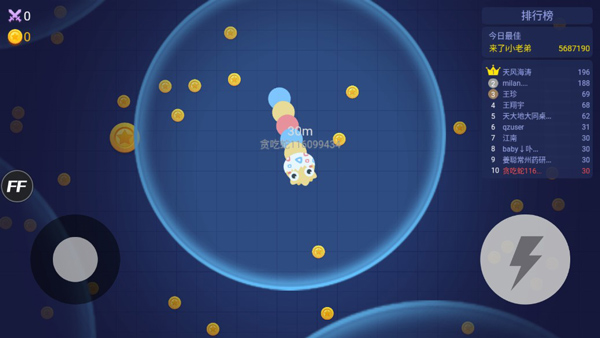 1、控制摇杆走位,吃掉地图上金币,就会变长。