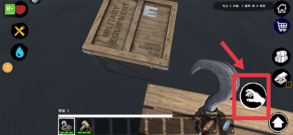 5、勾住后再次点击钩子按键,将勾住的物品拉回至木筏旁