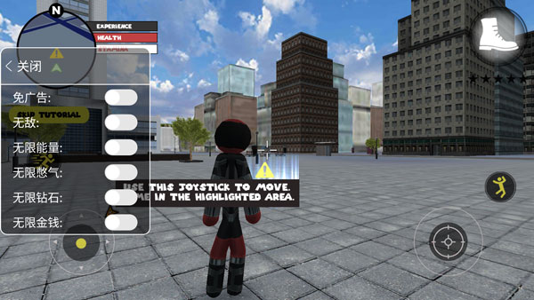左侧移动、加速,右侧绳索,攻击(跳跃),跳跃,右上侧的武器更换以及血量、经验的显示都实时更新,一览无遗,凭借着大家自由的玩法,与其他帮派的人物进行交火,期间杀人能够获得经验,杀多了会产生星级,警察和其他附近角色会特殊照顾你对你展开火热的进攻,而如何存活,如何将其他人物击杀则是你所需要完成的任务。