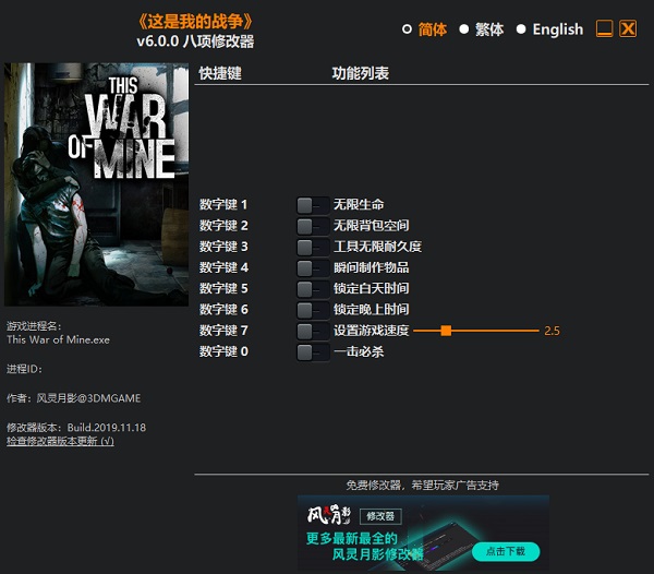 这是我的战争修改器风灵月影版是一款非常好用且功能强大的游戏修改器,专为《这是我的战争》游戏所制作。有了该修改器你可以对游戏中的八项内容进行修改,其中就包含了无限生命、无限背包空间、锁定白天时间、一击必杀等内容,在这些修改内容的帮助下,你会发现游戏难度会大大减低,从而享受到更加舒适的生存体验。另外,该修改器的使用方式也是十分方便,你只需要先打开游戏,然后打开修改器,最后选择你想要使用的功能就行了。有需求的朋友还在等什么,快来本站下载使用吧!