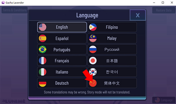 4、进入语言选择界面后选择中文,然后返回标题即可将游戏内语言切换为中文