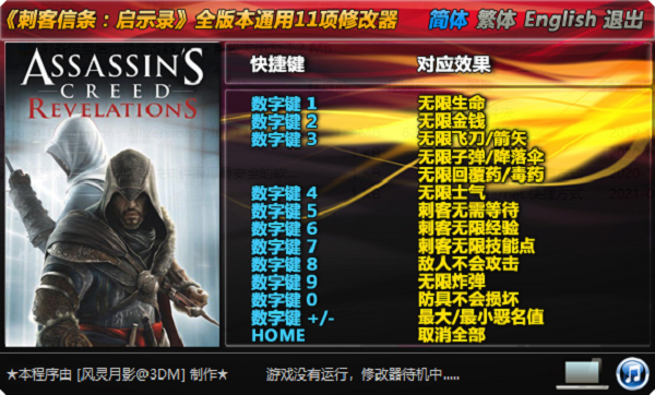 刺客信条启示录修改器风灵月影版是一款非常好用且功能强大的游戏修改器,是由风灵月影大神专门根据知名游戏《刺客信条启示录》所制作。通过该修改器玩家可以对《刺客信条启示录》中的游戏内容进行修改,而支持修改的内容足足有11项,其中就包含了无限生命、无限士气、敌人不会攻击、无限炸弹等内容,让玩家可以根据自身的游玩需求来自行选择。另外,该修改器的使用方式非常简单,玩家只需要先打开游戏,然后再打开修改器,之后在游戏界面按F3激活修改器,最后按下对应的快捷键触发对应的修改效果就行了。