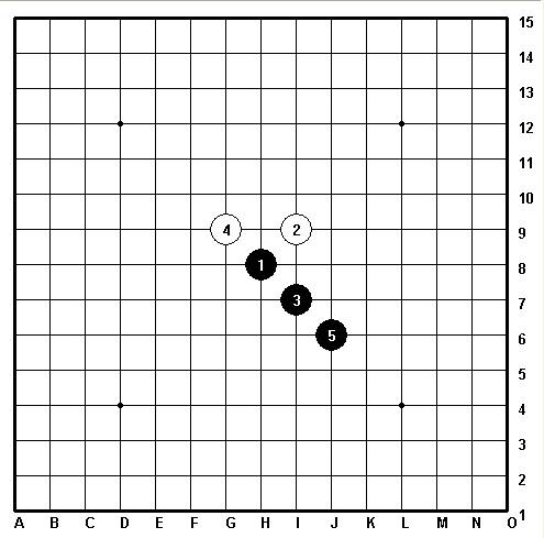 黑方四子呈四方形的摆布,因而得名。此阵多由明星、恒星、流星、金星、瑞星等开局演变而来。四角阵的特点是容易形成2、3支“剑”(棋语有云:三剑在手无不胜),局势利于向纵深发展。攻防的要点是夺先与反夺先,较少出现做棋的机会。在图五中,黑方的四角阵与白方的四角阵互相交错,称为双四角阵,是夺先与反夺先的典型。