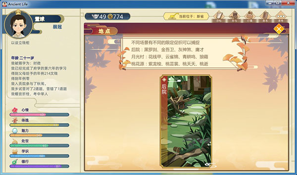 在古代人生电脑版中,玩家可以去武馆强身健体,可以备齐弓箭外出射猎,也可以抓好蛐蛐与友人斗蛐蛐,日常娱乐方式多样。