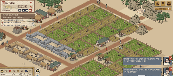 游戏左上角时间上对城镇的人口和繁荣进行判定:开局是人烟稀少,达50人是阡陌聚落,达150人是新晴村疃,达到300人是繁华小镇,后续可达600人(剧情模式玩到600人略有难度)。