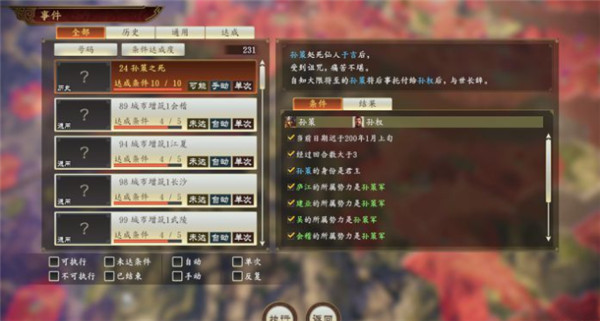 值得一提的是,本作的历史事件被设置成了手动触发的模式,也即允许玩家随时决定是否触发剧本事件。这看似赋予了玩家更大的自由度,但考虑到很多事件都会直接牵扯到玩家的切身利益,实际游玩下来的体验往往会变味。比如你扮演“群雄割据”时期的曹操,在即将吞并刘备的前夕,系统向你询问是否触发“三让徐州”的事件——你真的忍心吐出吃到嘴的肉,去尊重剧本和历史吗?还比如你扮演小霸王孙策,刚刚雄姿英发地打下了半壁江山。这时候系统告诉你“午时已到,该上路了”——你真的忍心老老实实地让自己当场去世么?我认为有些决定权不应该给到玩家手上,或者至少不应该以这种方式给到玩家手上。没有恰当的引导和限制,玩家自己很容易把游戏玩儿成最无聊的状况——具体放到这款游戏里,我正是因为时常顾及利弊得失,而与《三国志》系列的那份引以为傲的历史厚重感和沉浸感失之交臂。