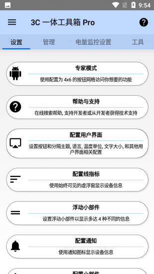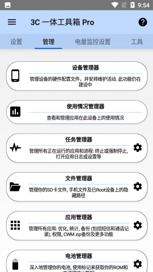 3C一体工具箱pro安卓版是一款专业的手机工具箱软件,主要就是为用户提供提倡生活中的便捷,里面的功能工具非常丰富,包含有设置、管理、电量监控设置等功能,还内置丰富的系统工具,很多人都在用。软件内的功能和工具全都是一目了然的,找起来也方便,各种功能可以帮助用户的大忙,日常需求都能满足哦!软件内有专业的设备管理器,能够帮助用户管理设备的硬件配置文件,并安排维护活动,还有文件管理器,能够帮你管理你的手机文件,各种文件路径都能一目了然。3C一体工具箱最新版能够帮助用户处理日程中的需求,还有超多隐藏功能让人很惊喜,除此以外,软件能够对你的手机信息进行全面检测处理,让大家全面掌握设备信息详情,随时可以查看,可以说功能相当多了,有需求的用户欢迎前来下载!