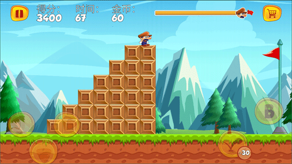 1、游戏玩法跟超级玛丽相差不多,进入游戏后,左边三个按钮控制角色移动,右边分别控制角色射击和跳跃;
