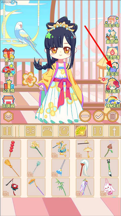 1、打开小游戏,进入主页面,页面中有盲盒、醉池、神秘彩虹、公主魔法、衣柜等,点击右侧生宝宝;
