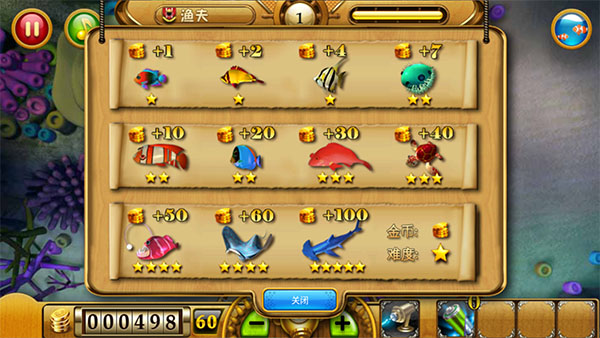 2、成功捕获的鱼儿都会化为滚滚金币,不同鱼群回报的金币数额也不尽相同。