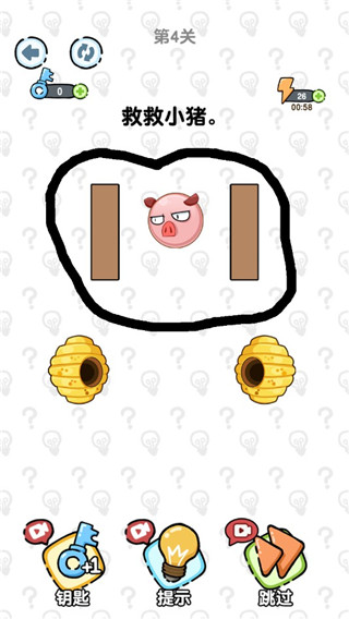 3、第四关,画一个大圆,将模板和猪猪一起包裹起来。