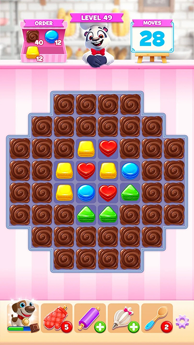 游戏完美遵循经典的三消规则,通过将两个连在一起的饼干互换位置以达成消除,期间只有三个或三个以上的串联饼干才能消除,且数量越多所获得积分也就越多,而且消除后所遗留的糕点还能在后期为你带来更多的积分效益。