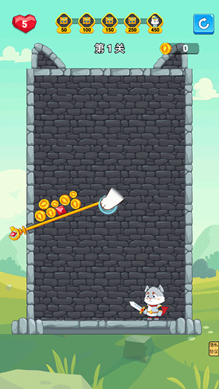 这关玩家需要先点击操作往左移动棍子,将钻石和金币掉下去给到小猫,即可过关。