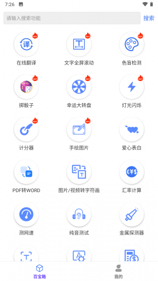 百宝箱app官方版是一款非常好用的手机工具软件,软件为用户提供了丰富多样的工具,包括在线翻译、计分器、手绘图片、测网速、文本替换、字数统计、尺子、水平仪等工具,这些工具都很实用,就拿在线翻译工具来讲,通过该工具用户可以直接将看不懂的语言文字翻译成看得懂的语言文字,不需要额外下载一个翻译软件,直接一款软件当成多款软件来使用。更棒的是,在百宝箱app官方版里出现的工具都可以直接使用,没有任何的限制,用户想用什么工具就用什么工具。另外,软件提供了搜索功能,可以直接搜索出自己当前需求的工具,不需要一个个寻找。