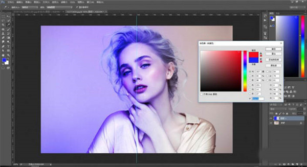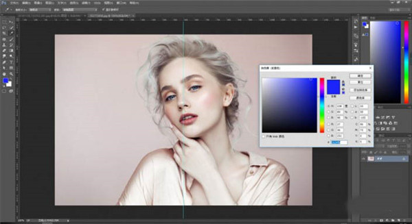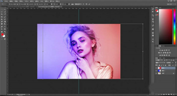2、在画布中拉一个参考线,竖直居中,并且设置前色板颜色如下