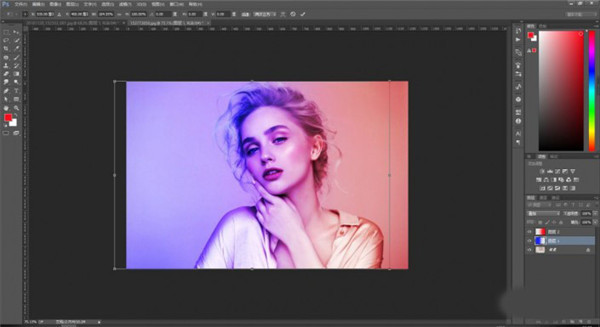 8、我们选中红色图层,并且按CTRL+T然后得到形状变换工具,横向拉长该图层并且左右调节找到合适的位置。(这么做的原因就是像液体稀释一样,体积变大进行变向稀释)并且我把该图层图明度继续调节为50%
