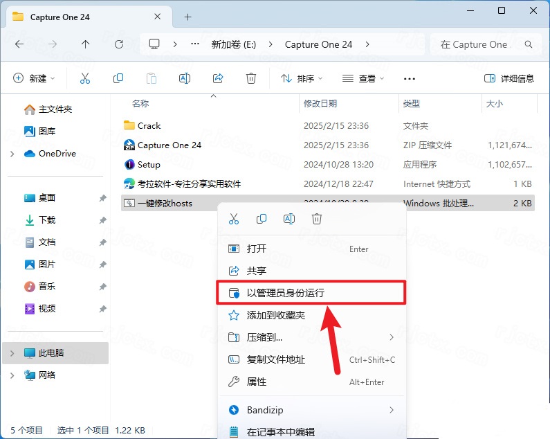 9.打开安装包解压后的【Capture One 24(64bit)】文件夹,鼠标右击【一键修改…】选择【以管理员身份运行】;
