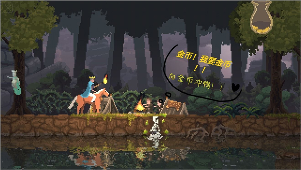 接下来我们向营地的方向走几步然后在扔下一个金币,流民又会跑去建金币,紧接着我们再次把金币收回来,反复几次后我们也快到营地了。