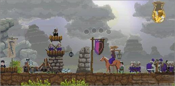 骑士:压马路的单位,升级城堡或者哨塔出现,6金的旗帜+招募1金的难民=领队的骑士,后面自动编队一群弓箭手,可以通过4金的攻击旗帜发动突击,注意,刚招募的骑士很弱,需要用金币喂养,并且招募足够的弓箭手,才能变成压路机;