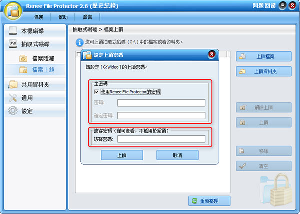 第一步:打开软体,点选“抽取式磁碟”中的“档案上锁”功能,“上锁资料夹”按钮。