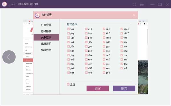 13、进入软件设置,可以对打开设置、自动播放、关联默认、鼠标滚轮和缩放显示进行设置。