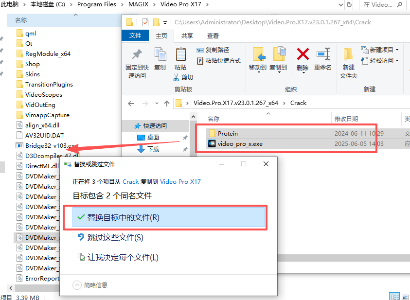 8、将Crack文件夹下的激活补丁复制到安装目录下,选择替换目标中的文件;