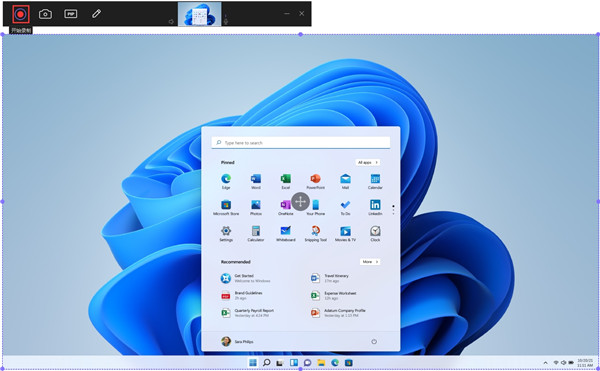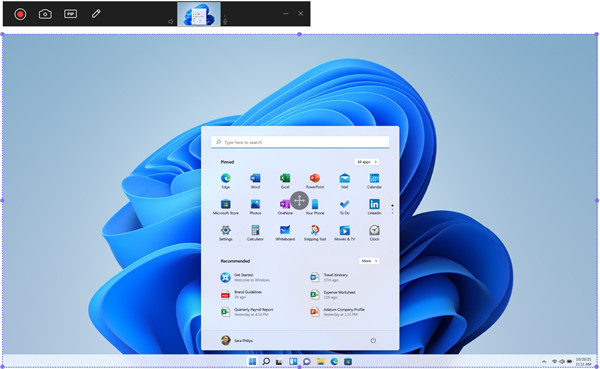 2、您可以单击全屏录制或者移动鼠标选择区域录制,拖动界面的中间的图标可移动录制窗口。