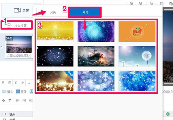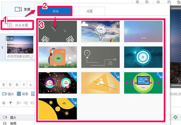 点击“片头片尾”——单击“片头”——单击选择“片头”中的模板。