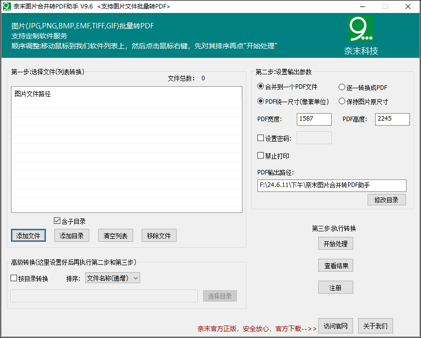 奈末图片合并转PDF助手官方版是一款非常专业的PDF的软件,该软件界面简洁,操作简单,新手小白也可以轻松上手使用哦。此外,还有图片预览功能,可以浏览图片和查看图片尺寸,十分方便。并且,支持JPG,PNG,BMP,EMF,TIF,GIF等等多种格式,无需为转码而忧愁了。同时,还支持PDF输出路径自定义,满足你的需求。而我今天给大家带来的是“奈末图片合并转PDF助手中文版”,还版本是中文的,无需为看不懂而忧愁了。不仅如此,这款软件还添加了批量功能,可以多个文件同时进行处理,大大的提高了效率还可以节省不必要的麻烦。除此之外,也可设置PDF打开密码,这样就不用担心信息泄露的情况发生了。有需要这款软件的朋友还在等什么,心动不如行动,快来下载体验吧!