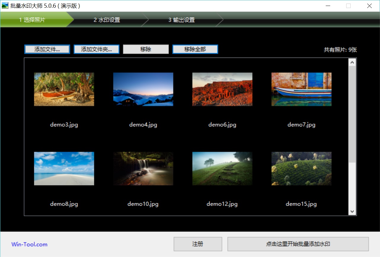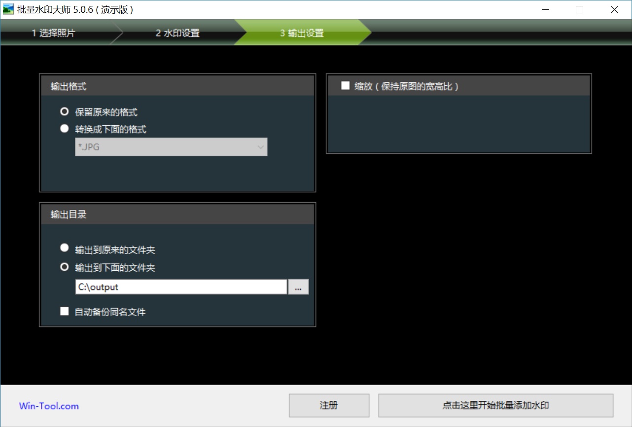 3、在“输出设置”中设置添加水印后的照片输出位置。点击主窗口最下方的按钮开始批量添加水印。