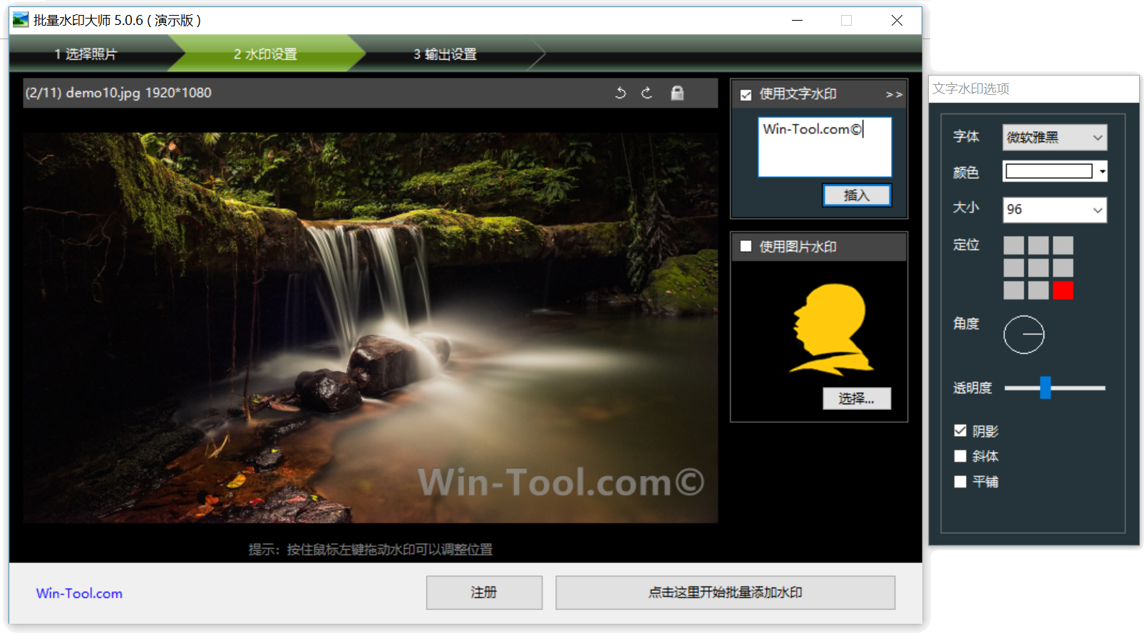 向导式的操作界面,实时预览水印制作效果,所见即所得。