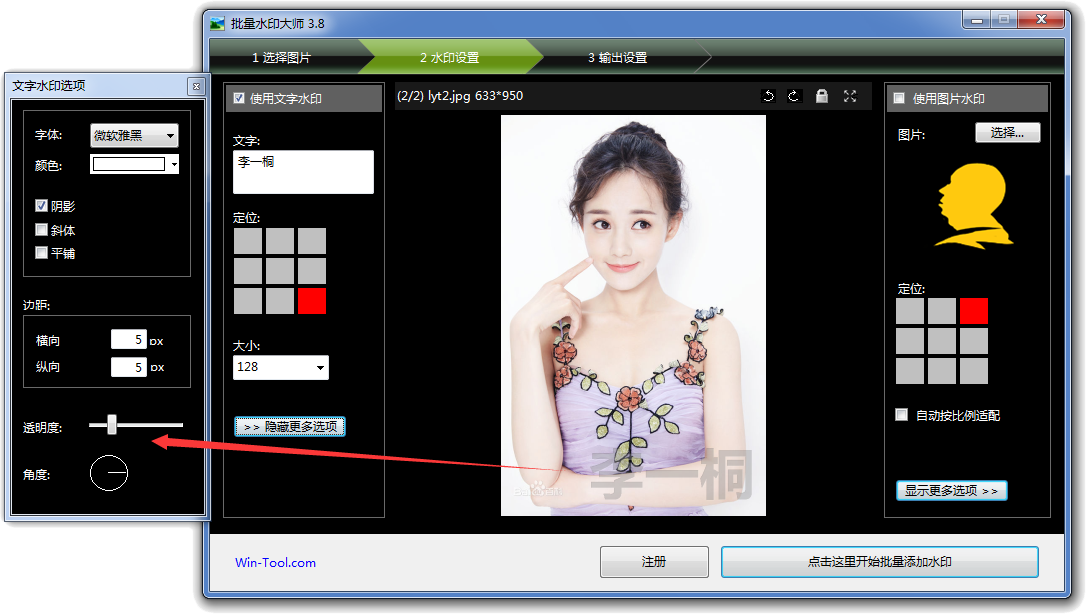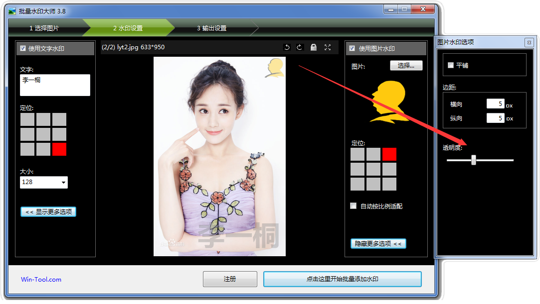 3、在图片水印选项窗口中也提供了调整透明度的功能。