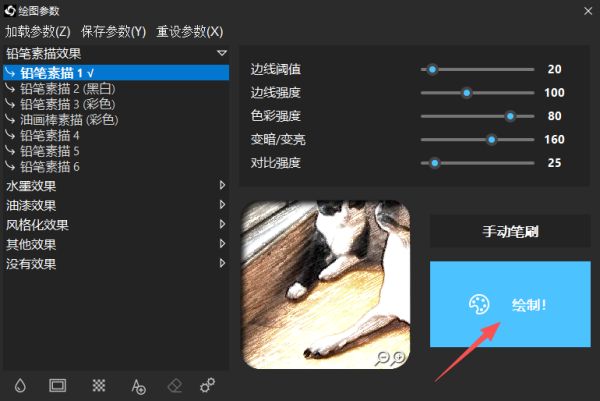 2、调整绘图参数,比如铅笔素描、边线阈值、对比强度等,点击绘制,便会开始处理。