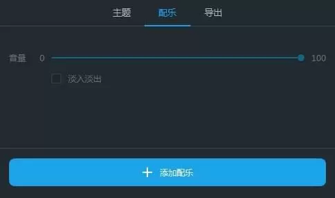 在界面右侧“配乐”功能模块下面,点击“+添加配乐”按键,即可从电脑或外部硬盘中导入音乐。移动音量滑块,即可调整配乐音量大小。勾选“淡入淡出”选项,即可将该效果应用在配乐中。